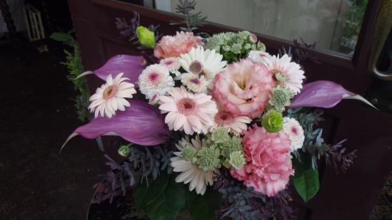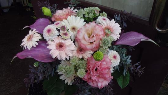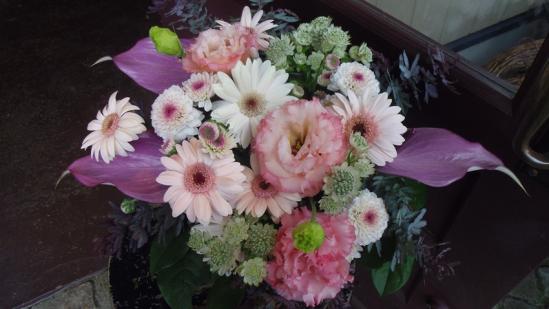 商品説明 薄桃色の花とグリーン、紫色を組合わせたシックなアレンジメントです。